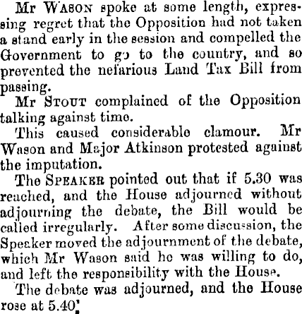 Mr Wason spoke at some length, expressing regret that the Opposition had not taken a stand early in tho session and compelled the Government to go to the country, and so prevented the nefarious Laud Tax Bill from passing. Mr Stout complained of the Opposition talking against time. This caused considerable clamour. Mr Wason and Major Atkinson protested against the imputation. The Speaker pointed out that if 5.30 was reached, and the House adjourned without adjourning the debate, the Bill would be called irregularly. After some discussion, the Speaker moved the ad journment of the debate, which Mr Wason said he was willing to do, and left the responsibility with the House. The debate was adjourned, and the House rose at 5.40 J