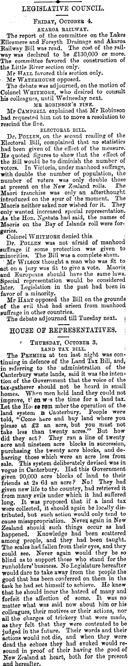 * LEGISLATIVE COUNCIL. Friday, Octobeb 4s. AKAEOA BAILWAY. The report of the committee on the Lakes Ellesmere and Forsyth Drainage and Akaroa Bailway Bill was read. The cost of the railway was declared to be £130,000 or more. The committee favored the construction of the Little River section only. Mr Hall favored this section only. Mr Watehuouse opposed. The debate was adjourned, on the motion of Colonel Whitmokb, who desired to consult his colleagues, until Wednesday next. ME ROBINSON'S BINE. Mr Campbell explained t hat Mr Robinson had requested him not to move a resolution to rescind the line. ELECTOEAL BILL. Dr. Pollen, on the second reading of the Electoral Bill, complained that no statistics had been given of the effect of the measure. He quoted figures to show that the effect of the Bill would bo to diminish the number of voters. In 'Victoria, under manhood suffrage, with double the number of population, the number of voters was only double those at present on the New Zealand rolls. The Maori franchise was only an afterthought introduced on the spur of the moment. The Maoris neither asked nor wished for it. They only wanted increased special representation. As the Hon. Ngatata had said, the names of Maoris on the Bay of Islands roll wore forgeries. Colonel Whitmoee denied this. Dr. Pollen was not afraid of manhood suffrage if some protection was given to minorities. The Bill was a complete sham. Mr Wilson thought a man who was fit to act on a jury was fit to give a vote. Maoris and Europeans should have the same laws. Special representation would be considered later. Legislation in the past had been in favor of a minority. Mr Habt opposed the Bill on the grounds of the evil that had arisen from manhood suffrage in other countries. The debate adjourned till Tuesday next, j HOUSE OF REPRESENTATIVES. > Thursday, Octobee 3. LAND TAX BILL. The Peemiee at ten last night was continuing in defence of the Land Tux Bill, and, in referring to the administration of the Canterbury waste lands, said it was the intention of the Government that the voice of the tax-gatherer should not be heard in small homes. When men held land they could not improve, t’enW'S the time for a land tax. Let the Hoi se rom mber the operation of the land system n Canterbury. People were told, “Come here and buy land where you please at £2 an acre, but you must not take less than twenty acres.” But how did they act? They ran a line of twenty acre and nineteen acre blocks in succession, purchasing the twenty acre blocks, and debarring those which were an acre less from sale. This system deliberately devised was in vogue in Canterbury. Had this Government given 90,000 acre blocks of land to their friends at 2s 6d an acre ? No! They had given now life to the country, had retrieved it from many evils under which it had suffered long. It was proposed that if a land tax were collected, it should again be locally distributed, but such action would only tend to cause misappropriation. Never again in New Zealand should such things occur as had happened. Knowledge had been scattered among people, and they had been taught. The scales had fallen from their eyes, and they could see. Never again would they be so blind as to support those who stand for the runholders’business. No Legislature hereafter would dare to take away from the people the good that has been conferred on them in the task ho had set himself to achieve. He knew that he should incur the hatred of many and forfeit the affection of some. It was no matter what was said now about him or his colleagues, their motives or their actions, nor all the charges of trickery that were made, as they felt that they were contented to be judged in the future. Their words and their actions would not die, and when they were dead the echoes they had evoked would resound in proof of their having the good of New Zealand at heart, both for the present and hereafter.
