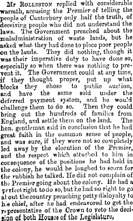 Mr Hollesxon replied with considerable ■warmth, accusing the Premier of telling the people of Canterbury only half the truth, of deceiving people who did not understand the laws. The Government preached about the maladministration of waste lands, but he asked what they had done to place poor people on the lands. They did nothing, though it was their imperative duty to have done so, especially so when there was nothing to prevent it. The Government could at any time, if they thought proper, put up what blocks they chose to public auction, and have the same sold under the deferred payment system, and ho would challenge them to do so. Then they could bring out the hundreds of families from England, and settle them on the land. The hon. gentleman said in conclusion that he had great faith in the common sense of people, and was sure, if they were not so completely led away by the elocution of the Premier, and the respect which attached to him in consequence of the positions he had hold in the colony, he would bo laughed to scorn for the rubbish he talked. Ho did not complain of the Premier going about the colony. He had a perfect right todo so, but ho had no right to go at out the country preaching petty disloyalty to h e chief, after tie had endeavored to got the representative of the Crown to votp the decision of both Houses of tho Legislature,
