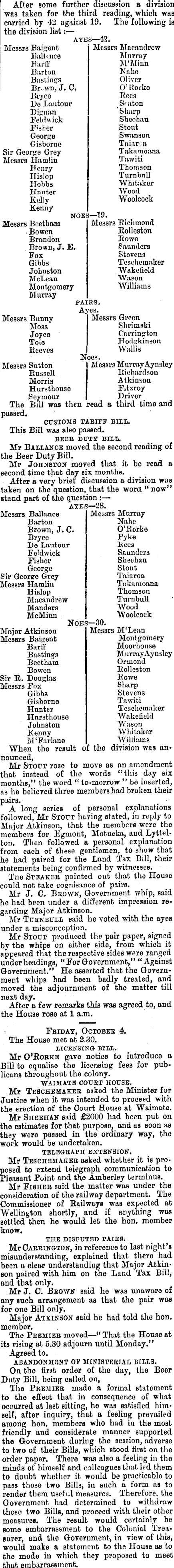 After some further discussion a division was taken for the third reading, which was carried by 43 against 10. Tho following is the division list: — ayes—l2. Messrs Baigent Messrs Macandrcw Ball: nee Murray Barff M'Minn Barton Kabo Bastings Oliver Br wn, J. C. O’ Korke Bryce Bees Do Lautour Seaton Dignan Sharp Feldwick Sheehan F'sher Stout George Swanson Gisborne Taiar a Sir George Grey Takamoana Messrs Hamlin Tawiti Henry Thomson Hislop Turnbull Hobbs Whitaker Hunter Wood Kdly Woolcock Kenny NOES— I 9. Messrs Bcetlmm Messrs Bichmond Bowen Eolleston Brandon Bowo Brown, J. E. Saunders Fox Stevens Gibbs Teschemaker Johnston Wakefield McLean Was on Montgomery Williams Murray PAIRS. Ayes. Messrs Bunny Messrs Green Moss Shrimski Joyce Carrington Tote Hodgkinson Beeves Wallis Noes. Messrs Sutton | Messrs Murray Aynsley Bussell Richardson Morris Atkinson Hur.-thonse Fitzroy Seymour Driver The Bill was then read a third time and passed. CUSTOMS TARIFF BILL. This Bill was also passed, BEER DUTY BILL. Mr Ballance moved the second reading of the Beer Duty Bill. Mr Johnston moved that it bo read a second time that day six months. After a very brief discussion a division was taken on tho question, that the word, “now” stand part of the question : ayes— 2B. Messrs Ballance Messrs Murray Barton Nahe Brown, J. C. O’Borke Bryce Pyke De Lautour Bees Feldwick Saunders Fisher Sheehan George Stout Sir George Grey Taiaroa Messrs Hamlin Takamoana Hislop Thomson Macandrcw Turnbull Manders Wood McMinn Woolcock Noes—3o. Major Atkinson Messrs MT.ean Messrs Baigent Montgomery Barff Moorhonse Bastings MurrayAynsley Beetbam Ormond Bowen Bolleston Sir B. Douglas Bowe Messrs Fox Sharp Gibbs Stevens Gisborne Tawiti Hunter Teschemaker Hursthouae Wakefield Johnston Wason Kenny Whitaker M’Farlane Williams When the result of the division was announced, Mr Stout rose to move as an amendment that instead of the words “this day six months,” the word “ to-morrow ” bo inserted, as ho believed three members had broken their pairs. A long series of personal explanations followed, Mr Stout having stated, in reply to Major Atkinson, that the members were the members for Kgmont, Motueka, and Lyttelton. Then followed a personal explanation from each of these gentlemen, to show that he had paired for the Land Tax Bill, their statements being confirmed by witnesses. Tne Speaker pointed out that the House could not take cognisance of pairs. Mr J, C. Brown, Government whip, said he had been under a different impression regarding Major Atkinson. Mr Turnbull said he voted with the ayes under a misconception. Mr Stout produced the pair paper, signed by the whips on either side, from which it appeared that the respective sides were ranged under headings, “ For Government,” “ Against Government.” Ho asserted that the Government whips had been badly treated, and moved the adjournment of tho matter till next day. After a few remarks this was agreed to, and the House rose at 1 a.m. Friday, October 4. The House met at 2.30. LICENSING BILL. Mr O’Bobke gave notice to introduce a Bill to equalise the licensing fees for publicans throughout the colony. WAIMATE COURT HOUSE. Mr Teschemaker asked the Minister for Justice when it was intended to proceed with the erection of the Court House at Waimate. Mr Sheehan said £2OOO had been put on the estimates for that purpose, and as soon as they were passed in the ordinary way, the work would be undertaken. telegraph extension. Mr Teschemaker asked whether it is proposed to extend telegraph communication to Pleasant Point and the Amberley terminus. Mr Fisher said the matter was under the consideration of the railway department. The Commissioner of Bailways was expected at Wellington shortly, and if anything was settled then he would let the hon, member know. THE DISPUTED PAIRS. Mr Carrington, in reference to last night’s misunderstanding, explained that there had been a clear understanding that Major Atkinson paired with him on tho Land Tax Bill, and that only. Mr J. C. Brown said he was unaware of any such arrangement us that the pair was for one Bill only. Major Atkinson said he had told the hon. member. The Premier moved —“ That the House at its rising at 5.30 adjourn until Monday.” Agreed to. ABANDONMENT OF MINISTERIAL BILLS. On the first order of tho day, the Beer Duty Bill, being called on, The Premier made a formal statement to the effect that in consequence of what occurred at last sitting, he was satisfied himself, after inquiry, that a feeling prevailed among hon, members who had in the most friendly and considerate manner supported the Government during the session, adverse to two of their Bills, which stood first on the order paper. There was also a feeling in the minds of himself and colleagues that led them to doubt whether it would be practicable to pass those two Bills, in such a form as to render them useful measures. Therefore, the Government had determined to withdraw those two Bills, and proceed with their other measures. The result would certainly be some embarrassment to the Colonial Treasurer, and the Government, in view of this, would make a statement to the House as to the mode in which they proposed to meet that embarrassment.