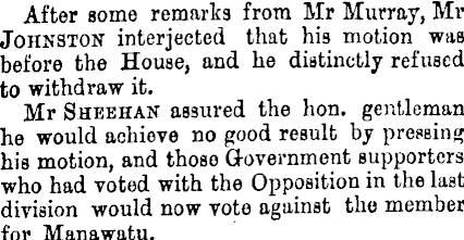 After some remarks from Mr Murray, Mr Johnston interjected that his motion was before the House, and he distinctly refused to withdraw it. Mr Sheehan assured the lion, gentleman he would achieve no good result by pressing his motion, and those Government supporters who had voted with the Opposition in the last division would now vote against tho member for Manawatu.