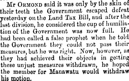 Mr Okmond said it was only by tho skin of their teeth tho Government escaped defeat yesterday outlie Land Tax Bill, and after the lust division, he considered the cup of humiliation of the Government was now full. He had been called a false prophet when he told the Government they could not pass their measures, but lie was right. Now, however, as they had achieved their objects in gosling these un just measures withdrawn, ho hoped tho member for Manawatu would withdraw his motion.
