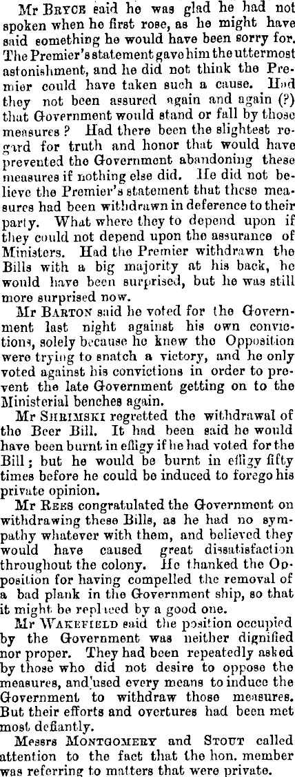Mr Bryce said he was glad he had not spoken when he first rose, as he might have said something he would have been sorry for. The Premier’s statement gave him the uttermost astonishment, and ho did not think the Premier could have taken such a cause. Had they not been assured again and again (?) that Government would stand or fall by those measures ? Mad there been the slightest regard for truth and honor that would have prevented the Government abandoning these measures if nothing else did. Me did not believe the Premier’s statement that these measures had been withdrawn in deference to their parly. What where they to depend upon if they could not depend upon the assurance of Ministers. Had the Premier withdrawn the Bills with a big majority at his back, he would have been surprised, but he was still more surprised now. Mr Barton said ho voted for (ho Government last night against his own convictions, solely because he knew the Opposition were trying to snatch a victory, and ho only voted against his convictions in order to prevent the late Government getting on to the Ministerial benches again. Mr Shhimski regretted the withdrawal of tho Beer Bill. It had been said he would have been burnt in efllgy if he had voted for the Bill; but he would be burnt in elligy fifty times before he could be induced to forego his private opinion. Mr Bees congratulated the Government on withdrawing these Bills, as he had no sympathy whatever with them, and believed they would have caused great dissatisfaction throughout the colony. Me t hanked the Goposition for having compelled the removal of a bad plank in the Government ship, so that it might be repl iced by a good one. Mr Wakefield said the position occupied by the Government was neither dignified nor proper. They had been repeatedly asked by those who did not desire to oppose the measures, and'used every means to induce the Government to withdraw those measures. But their efforts and overtures had been met most defiantly. Messrs Montgomery and Stout called attention to the fact that the hon. member was referring to matters that were private.