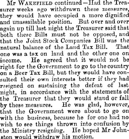 Mr Wakefield continued—Had the Treasurer weeks ago withdrawn these measures, they would have occupied a more dignified and unassailable position. But over and over again up till last night the Treasurer said that both these Bills must not be opposed, and that the Joint Slock Companies Bill was the natural balance of the Land Tax Bill. That one was a tax on land and the other one on income. Ho agreed that it would not be right for the Government to go to the country on a Beer Tax Bill, but they would have consulted their own interests better if they had resigned on sustaining tho defeat of last night, in accordance with tho statements of the Treasurer that they would stand or fall by these measures. He was glad, however, that tho Government were about to go on with the business, because he for one had no wish to see things thrown into confusion by the Ministry resigning. Ho hoped Mr Johnston would withdraw his motion.