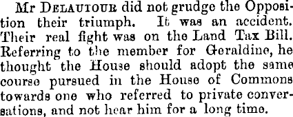Mr Delauxoub did not grudge the Opposition their triumph. It was an accident. Their real fight was on tho Land Tax Bill. Referring to the member for Geraldine, he thought the House should adopt the same course pursued iu the House of Commons towards one who referred to private conversations, and not hear him for a long time.