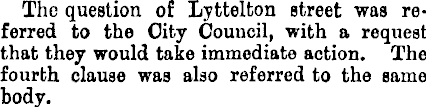 The question of Lyttelton street was referred to the City Council, with a request that they would take immediate action. The fourth clause was also referred to the same body.