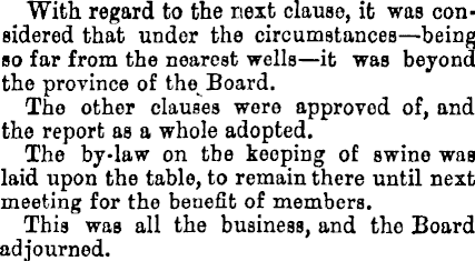 With regard to the next clause, it was considered that under the circumstances—being so far from the nearest wells—it was beyond the province of the Board. The other clauses wore approved of, and the report as a whole adopted. The by-law on the keeping of swine was laid upon the table, to remain there until next meeting for the benefit of members. This was all the business, and the Board adjourned.