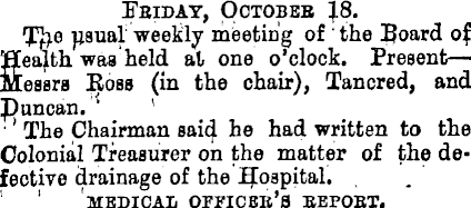 Friday, October 18. Tfie psual weekly meeting of the Board of Heafth was held at one o’clock. Present — Messrs Ross (in the chair), Tancred, and P uncan. 1 The Chairman said he had written to the Colonial Treasurer on the matter of the defective drainage of the Hoapital. MEDICAD OTTICEB’a REPORT.
