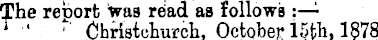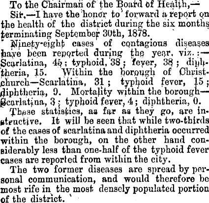 To the Chairman of the Board of Health,— Sit, —I have the honor to' forward a report on the health of the district during the six months terminating September 30th, 1878. JJinetyejght cases of contagions diseases jhaye been reported during the year, viz. : Scarlatina, 45 ; typhoid, '3B ; feyer, 38 ; diphtheria, 15. Within the borough of Christchurch—Scarlatina, 31 ; typhoid fever, |5; diphtheria, 9. Mortality within the borough— Scarlatina, 3 ; typhoid fever, 4; diphtheria, 0. Tbpse statistics, as far as they go, are instructive, It will be seen that while two-thirds of the cases of scarlatina and diphtheria occurred within the borough, on the other hand considerably less than one-half of the typhoid fever cases are reported from within the city. The two former diseases are spread by personal communication, and would therefore be most rife in the most densely populated portion of the district.