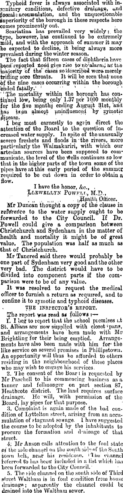 Typhoid fever is always associated with insanitary conditions, defective drainage, and jfoecali accumulation, and the unquestionable Superiority of the borough in those respects hero comes prominently out. Scarlatina has prevailed very widely; the type, however, has continued to be extremely mild, and with the approach of summer it may he expected to decline, it being always more prevalent during the winter season. The fact that fifteen cases of diphtheria have been reported Peed give rise to nb'alarm, at the Majority of the' cases so'described wore, merely trifling sore throats. It will be seen that none the nine cases occurring within the borough 'ended fatally.' 1 ' 1 The mortality within the borough has continued low, being only' 1.37 per 1(]00 monthly fop the five mpnthji ending Aqguat Blst, arid has f)« pn almost uninfluenced by zyinotic pjgeasp. I beg most earnestly to again direct the attention of the Board to the question of increased water supply. In spite of the unusually severe freshets and floods in the rivers, more particularly the Waimakariri, with which our artesian sources have been supposed to communicate, the level of the rfrells continues so low that in the higher parts of the town some of the pipes have at this early period of tho summer required to he cut down in order to obtain a flow. I have the honor, &c., LpewbUjTN Powfltj, M.D., ... ,i ~ i^fialthOfficer. Mr Duncan thought a copy of the clause in reftfreriCe to the water supply ought to he forwarded to the City Council. If Dr. Powell could give a comparison between Christchurch and Sydenham in the matter of health and mortality it might be of great value. The population was half as much as that of Christchurch. Mr Tancred said there would probably be one part of Sydenham very good and tho other very bad. The district would have to be divided into component parts if the comparison were to be of any value. It was resolved to request the medical officer to furnish a return as required, and to confine it to zjmotic and typhoid diseases. THE INSPECXOB’S BEPOBT. Tbs report was read as follows iI*. I beg to report that the school premises at St. Albans are now supplied with closet 'pans, and arrangements have been made with Mr Brightling for their being emptied. Arrangements have also been made with him for 1 the like service on several premises in Phillipstown. An opportunity will thus be afforded to others residing in the neighbourhood of those places who may wish to engage his services. 2. The consent of the boar t is requested by Mr Paschell to his commencing business as a tanner and fellmonger on part section 87, Heathcote district. Tho land requires surface drainage. He will, with permission of the Board, lay pipes for that purpose. 3. Complaint is again made of the bad condition of Lyttelton street, arising from an accumulation of stagnant sewage. I have suggested the course to be adopted by the inhabitants to procure the formation and drainage of that street. 4; Mr Anson calls attention to the fmd state PI the sidy channel on tho south side of the South town belt, near his residence, 'llio channel foferred t'o has beert included in a list which has' been forwarded to tho City Council. 5. The side channel on tho south side of Third street Waltham is in foul condition from house drainage; apparently tho channel could he drained into the Waltham sewer.