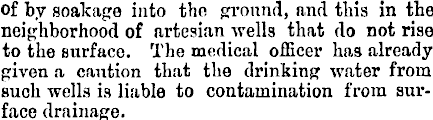 of by soakage into the ground, and this in the neighborhood of artesian wells that do not rise to the surface. The medical officer has already given a caution that the drinking water from such wells is liable to contamination from surface drainage.