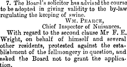 7. The Board’s solicitor has ad vis 3d tbe course to be adopted in giving validity to the by-law regulating tbe keeping of swine. Wm. Pearce, Chief Inspector of Nuisances. With regard to the second clause Mr F. E. Wright, on behalf of himself and several other residents, protested against the establishment of the fellmongory in question, and asked the Board not to grant the applicalion.
