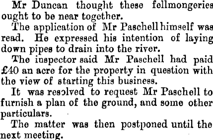 Mr Duncan thought these follmongories ought to be near together. The application of Mr Paschell himself was read. Ho expressed his intention of laying down pipes to drain into the river. The inspector said Mr Paschell had paid £4O an acre for the property in question with the view of starting this business. It was resolved to request Mr Paschell to furnish a plan of the ground, and some other particulars. The matter was then postponed until the next meeting.