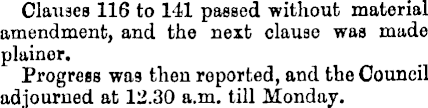 Clauses 116 to 141 passed without material amendment, and the next clause was made plainer. Progress was then reported, and the Council adjourned at 12.30 a.m. till Monday.