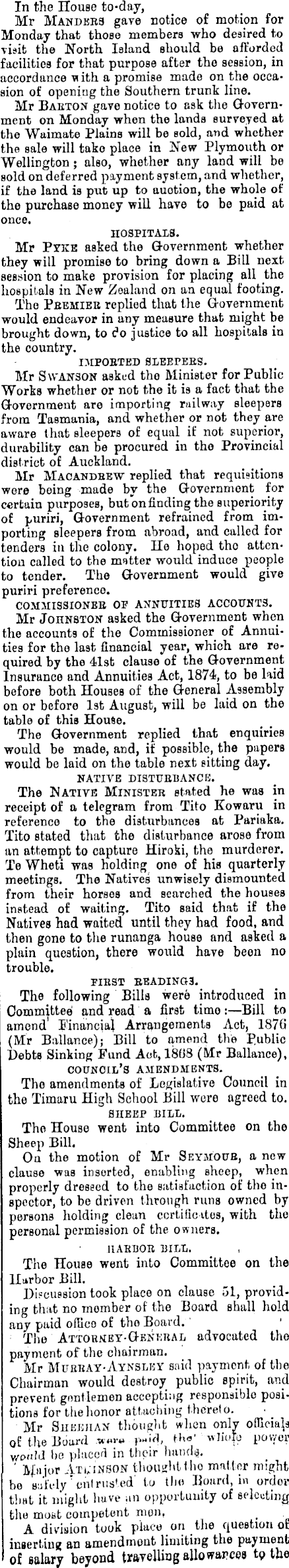 In the House to-day, Mr Mandbbs gave notice of motion for Monday that those members who desired to visit the North Island should be afforded facilities for that purpose after the session, in accordance with a promise made on the occasion of opening the Southern trunk line. Mr Barton gave notice to ask the Government on Monday when the lands surveyed at the Waimate Plains will bo sold, and whether the sale will take place in New Plymouth or Wellington; also, whether any land will be sold on deferred payment system, and whether, if the land is put up to auction, the whole of the purchase money will have to bo paid at once. HOSPITALS. Mr Puke asked the Government whether they will promise to bring down a Bill next session to make provision for placing all the hospitals in New Zealand on an equal footing. The Pbemiee replied that t lie Government would endeavor in any measure that might be brought down, to do Justice to all hospitals in the country. IMPORTED SLEEPERS. Mr Swanson asked tho Minister for Public Works whether or not the it is a fact that the Government are importing railway sleepers from Tasmania, and whether or not they are aware (hat sleepers of equal if not superior, durability can be procured in tho Provincial district of Auckland. Mr Macandbew replied that requisitions were being made by tho Government for certain purposes, but onflnding the superiority of puriri, Government refrained from importing sleepers from abroad, and called for tenders in the colony. Ho hoped the attention called to the matter would induce people to tender, Tho Government would give puriri preference. COMMISSIONER OF ANNUITIES ACCOUNTS. Mr Johnston asked the Government when the accounts of the Commissioner of Annuities for tho last financial year, which are required by the 41st clause of the Government Insurance and Annuities Act, 1874, to be laid before both Houses of the General Assembly on or before Ist August, will be laid on the table of this House. The Government replied that enquiries would be made, and, if possible, the papers would be laid on the table next sitting day. NATIVE DISTURBANCE. The Native Minister stated he was in receipt of a telegram from Tito Kowaru in reference to the disturbances at Kanaka. Tito stated that tho disturbance arose from an attempt to capture Hiroki, the murderer. To Wheti was holding one of his quarterly meetings. Tho Natives unwisely dismounted from their horses and searched the houses instead of waiting. Tito said that if the Natives had waited until they had food, and then gone to the runanga house and asked a plain question, there would have been no trouble. first readings. The following Bills were introduced in Committee and read a first time: —Bill to amend' Financial Arrangements Act, 1876 (Mr Ballance); Bill to amend the Public Debts Sinking Fund Act, 1868 (Mr Ballance), council’s amendments. The amendments of Legislative Council in the Timaru High School Bill wore agreed to. sheep bill. The House went into Committee on the Sheep Bill. On tho motion of Mr Seymour, a new clause was inserted, enabling sheep, when properly dressed to the satisfaction of tho inspector, to be driven through runs owned by persona holding clean certificates, with the personal permission of the owners. harbor bill. The House went into Committee on the Harbor Bill. Discussion look place on clause 51, providing that no member of tho Board shall hold any paid office of tho Board. The Attorney-General advocated tho payment of the chairman. Mr Muhbay-Aynsley said payment of the Chairman would destroy public spirit, and prevent gentlemen accepting responsible positions for the honor attaching thereto. Mr Sheehan thought when only officials of the Board w«.-« (-id, tho' wllofo power would be placed in their hands. ' Major Atainson thought t he matter might bo safely r entrusted' to the Board, in order that it might have an opportunity of selecting the most competent men. A division took place on the question or inserting an amendment limiting the payment of salary beyond tJfftvelling allowaiucoa tp the