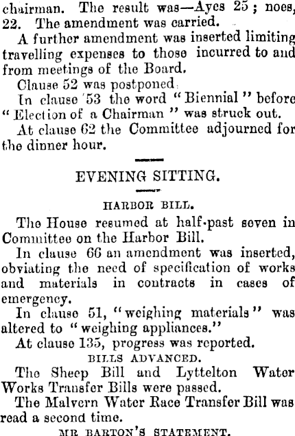 chairman. The result was—Ayes 25 ; noes, 22. The amendment was carried. A further amendment was inserted limiting travelling expenses to those incurred to and from meetings of the Board, Clause 52 was postponed [n clause 53 the word “ Biennial ” before “ Election of a Chairman ” was struck out. At clause 62 the Committee adjourned for the dinner hour. EVENING SITTING. HARBOR BILL. The House resumed at half-past seven in Committee on the Harbor Bill. In clause 60 an amendment was inserted, obviating the need of specification of works and materials in contracts in eases of emergency. In clause 51, “weighing materials” was altered to “weighing appliances.” At clause 135, progress was reported. BILLS ADVANCED. The Sheep Bill and Lyttelton Water Works Transfer Bills wore passed. The Malvern Water Race Transfer Bill was read a second time. MR BARTON’S STATEMENT.