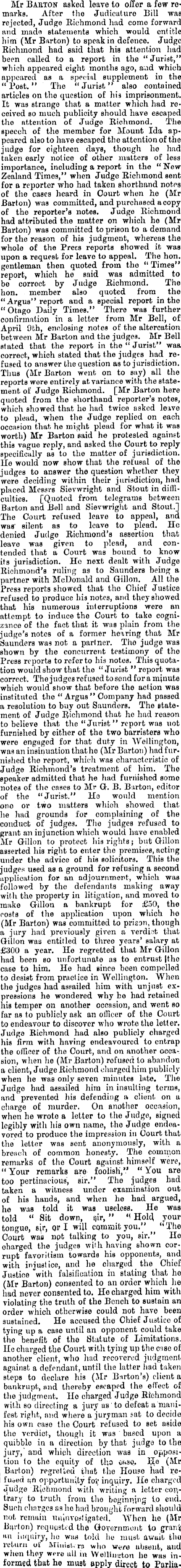 Mr Barton asked leave to offer a few remarks. After the Judicature Bill was rejected, Judge Richmond had come forward 1 and made statements which would entitle him (Mr Barton) to speak in defence. Judge Richmond had said that his attention Had been called to a report in the “Jurist,” which appeared eight months ago, and which appeared as a special supplement in the “Post.” The “Jurist” also contained articles on the question of his imprisonment. It was strange that a matter which had received so much publicity should have escaped the attention of Judge Richmond. The speech of the member for Mount Ida appeared also to have escaped the attention of the judge for eighteen days, though he had taken early notice of other matters of less importance, including a report in the “Now Zealand Times,” when Judge Richmond sent for a reporter who had taken shorthand notes of the cases heard in Court when he (Mr Barton) was committed, and purchased a copy of the reporter’s notes. Judge Richmond had attributed the matter on wliich he (Mr Barton) was committed to prison to a demand for the reason of his judgment, whereas the whole of the Press reports showed it was upon a request for leave to appeal. The hon. gentleman then quoted from the “Times” report, which he said was admitted to bo correct by Judge Richmond. The hon. member also quoted from the “ Argus” report and a special report in the “ Otago Daily Times.” There was further conlirmation in a letter from Mr Bell, of April 9fch, enclosing notes of the altercation between Mr Barton and the judges. Mr Bell stated that the report in the “Jurist” waa correct, which stated that the judges had refused to answer the question as to jurisdiction. Thus (Mr Barton went on to say) all the reports wore entirely at variance with the statement of Judge Richmond. [Mr Barton here quoted from the shorthand reporter’s notes, which showed that he had twice asked leave to plead, when the Judge replied on each occasion that he might plead for what it was worth) Mr Barton said he protested against this vague reply, and asked the Court to reply specifically as to the matter of jurisdiction. Ho would now show that the refusal of the judges to answer the question whether they were deciding within their jurisdiction, had placed Messrs Sievwright and Stout in difficulties. [Quoted from telegrams between Barton and Bell and Sievwright and Stout.] The Court refused leave to appeal, and was silent as to leave to plead. He denied Judge Richmond’s assertion that leave was given to plead, and contended that a Court was bound to know its jurisdiction. Ho next dealt with Judge Richmond’s ruling as to Saunders being a partner with McDonald and Gillon. All the Press reports showed that tho Chief Justice refused to produce his notes, and they showed that his numerous interruptions were an attempt to induce the Court to take cognizance of tho fact that it was plain from tho judge’s notes of a former hearing that Mr Saunders was not a partner. Tho judge was shown by the concurrent testimony of the Press reports to refer to his notes. This quotation would show that tho “ Jurist ” report was correct. Tho j udges refused to send for a minute which would show that before tho action was instituted tho “ Argus ” Company had passed a resolution to buy out Saunders. The statement of Judge Richmond that lie had reason to believe that the “Jurist ” report was not furnished by cither of tho two barristers who were engaged for that duty in Wellington, was an insinuation that ho (Mr Barton) had furnished tho report, which was characteristic of Judge Richmond’s treatment of him. The speaker admitted that he had furnished some notes of the cases to Mr G. E. Barton, editor of the “Jurist.” Ho would mention one or two matters which showed that lie had grounds for complaining of the conduct of judges. Tho judges refused to grant an injunction which would have enabled Mr Gillon to protect his rights; but Gillon asserted his right to enter the premises, acting under the advice of his solicitors. This the judges used as a ground for refusing a second application for an adjournment, which was followed by the defendants making away with the property in litigation, and moved to make Gillon a bankrupt for £SO, tho costs of the application upon winch ho (Mr Barton) was committed to prison, though a jury had previously given a verdict that Gillon was entitled to three years’ salary at £3OO a year. Ho regretted that Mr Gillon had been so unfortunate as to entrust (the case to him. Ho had since been compelled to desist from practice in Wellington. When the judges had assailed him with unjust expressions he wondered why ho had retained his temper on another occasion, and went so far as to publicly ask an officer of the Court to endeavour to discover who wrote the letter. Judge Richmond had also publicly charged his firm with having endeavoured to entrap the officer of the Court, and on another occasion, when lie (Mr Barton) refused to abandon a client, J udge Richmond charged him publicly when he was only seven minutes late. The Judge had assailed him in insulting terms, and prevented his defending a client on a charge of murder. On another occasion, when ho wrote a letter to the Judge, signed legibly with His own name, the Judge endeavored to produce the impression in Court that the letter was sent anonymously, with a breach of common honesty. The comamn remarks of the Court against himself were, “ Your remarks are foolish,” “ You are too pertinacious, sir.” Tho judges had taken a witness under examination out of his bauds, and when he had argued, ho was told it was useless. He was told “ Sit down, qir, ” *« Hole* your tongue, sir, qr I will commit you.” “The Court was not talking to you, sir.” Ho charged the judges with having shown corrupt favoritism towards his opponents, and with iniustice, and ho charged the Chief Justice “with