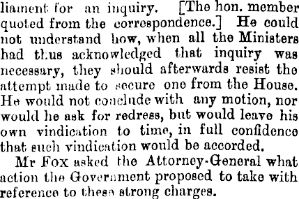 liament For an inquiry. [The hon. member quoted from the correspondence.] He could not understand how, when all the Ministers had thus acknowledged that inquiry was necessary, they should afterwards resist the attempt made to secure one from the House. He would not conclude with any motion, nor would he ask for redress, but would leave his own vindication to time, in full confidence that such vindication would be accorded. Mr Fox asked the Attorney-General what action the Government proposed to take with reference to these strong charges.
