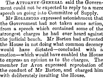 The Attorney-General said the Government could not he expected to reply to a mere speech on going into Committee of Supply. Mr Rolleston expressed astonishment that the Government had not taken some action, from a speech which contained some of the strongest charges ho had ever heard against the judicial bench. Mr Barton had affronted the House in not doing what common decency would have dictated —concluded with a motion—which would have enabled the House to express an opinion as to the charges. The member for Avon expressed reprobation of the conduct of Mr Barton, and charged him with deliberately insulting the House.