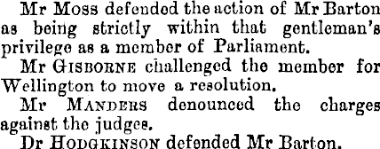 Mr Moss defended the action of Mr Barton as being strictly within that gentleman’s privilege as a member of Parliament, Mr Gisborne challenged the member for Wellington to move a resolution. Mr Mandebs denounced the charges against the judges. Dr Hodgkinson defended Mr Barton.