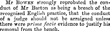 Mr Bowen strongly reprobated the conduct of Mr Barton as being a breach of the recognised English practice, that the conduct of a judge should not be arraigned unless there were primu facie evidence to justify his removal from the bench.
