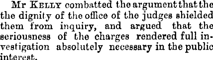 Mr Kelly combatted the argument that the the dignity of the office of the judges shielded them from inquiry, and argued that the seriousness of the charges rendered full investigation absolutely necessary in the public interest.