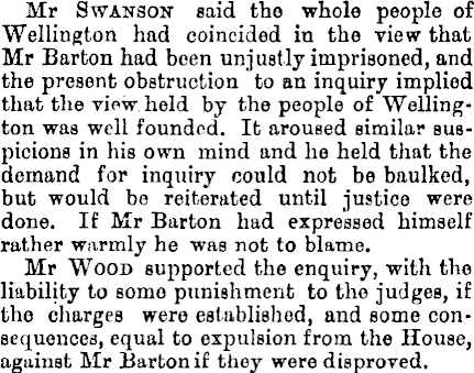 Mr Swanson said the whole people of Wellington had coincided in the view that Mr Barton had been unjustly imprisoned, and the present obstruction to an inquiry implied that the view held by the people of Wellington was well founded. It aroused similar suspicions in his own mind and he held that the demand for inquiry could not bo baulked, but would be reiterated until justice were done. If Mr Barton had expressed himself rather warmly ho was not to blame. Mr Wood supported the enquiry, with the liability to some punishment to the judges, if the charges were established, and some consequences, equal to expulsion from the House, against Mr Barton if they were disproved.