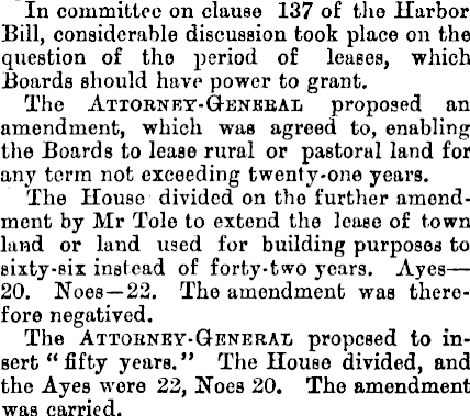 In committee on clause 137 of the Harbor Bill, considerable discussion took place on the question of the period of leases, which Boards should have power to grant. The Attorney-General proposed an amendment, which was agreed to, enabling the Boards to lease rural or pastoral land for any term not exceeding twenty-one years. The House divided on the further amendment by Mr Tolo to extend the lease of town land or laud used for building purposes to sixty-six instead of forty-two years. Ayes—--20. Noes —22. The amendment was therefore negatived. The Attorney-General proposed to insert “fifty years.” The House divided, and the Ayes were 22, Noes 20. The amendment was carried.