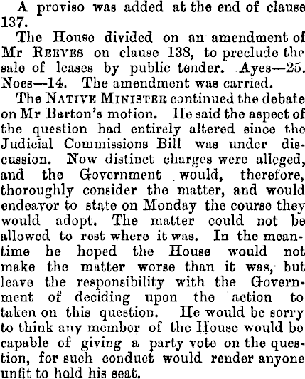 A proviso was added at the end of clause 137. The House divided on an amendment of Mr Reeves on clause 138, to preclude the sale of leases by public tender. Ayes—2s. Noes —14. The amendment was carried. The Native Minister continued the debate on Mr Barton’s motion. Ho said the aspect of the question had entirely altered since the Judicial Commissions Bill was under discussion. Now distinct charges were alleged, and the Government would, therefore, thoroughly consider the matter, and would endeavor to state on Monday the course they would adopt. The matter could not be allowed to rest where it was. In the meantime he hoped the House would not make the matter worse than it was, but leave the responsibility with the Government of deciding upon the action to taken on this question. He would be sorry to think any member of the House would bo capable of giving a party vote on the question, for such conduct would render anyone unfit to hold his seat.