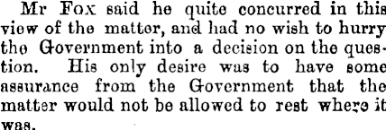 Mr Fox said he quite concurred in this view of the matter, and had no wish to hurry the Government into a decision on the question. His only desire was to have some assurance from the Government that the matter would not be allowed to rest where it was.