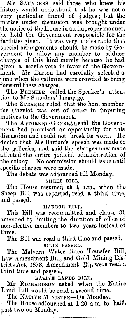 Mr Sahndees said those who knew his history would understand that he was not a very particular friend of judges; but the matter under discussion was brought under the notice of the House in an improper manner, ho held the Government responsible for the facilities given, lb waa very undesirable that special arrangements should be made by Goverment to allow any member to adduce charges of this kind merely because be had given a servile vote in favor of the Government. Mr Barton had carefully selected a time when the galleries were crowded to bring forward these charges. The Peemieb called the Speaker’s attention to Mr Saunders’ language, The SpEAEEB rtffed that the hon. member for Cheviot was out of order in imputing motives to the Government. The Attoenev-Genkeal said the Government had promised an opportunity for this discussion and could not break its word. He denied that Mr Barton’s speech was made to the galleries, and said the charges now made affected the entire judicial administration of the colony. No commission should issue until specific charges were made. The debate was adjourned till Monday. SHEEP BILL. The House resumed at a.m., when the Sheep Bill waa reported, read a third lime, and passed. HAKBOE PULL. This Bill was recommitted and clause 31 amended by limiting the duration of office of non-elective members to two years instead of three. The Bill was read a third time and passed. BILLS PASSED. The Malvern Water Race Transfer Bill, Law Amendment Bill, and Gold Mining Districts Act, 1873, Amendment DUs were reat^ll third time and passed, VA*TVJB LANDS BILL. Mr Richabdson asked when the Native Land Bill would bo read a second time. The Native Ministee—On Monday. The House adjourned at 1.20 a.m. to, halfpast two on Monday.
