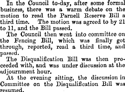 In the Council to-day, after some formal business, there was a warm debate on the motion to read the Parnell Reserve Bill a third time. The motion was agreed to by 21 to 11, and the Bill passed. The Council then went into committee on the Fencing Bill, which was finally got through, reported, read a third time, and passed. The Disqualification Bill was then proceeded with, and was under discussion at the adjournment hour. At the evening sitting, the discussion in Committee on the Disqualification Bill was resumed.