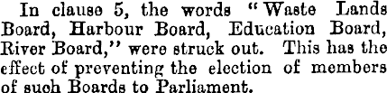In clause 5, the words “ Waste Lands Board, Harbour Board, Education Board, River Board,” were struck out. This has tho effect of preventing the election of members of such Boards to Parliament.