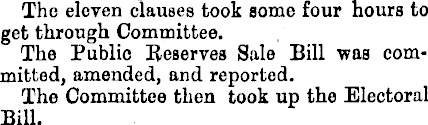 The eleven clauses took some four hours to get through Committee, The Public Reserves Sale Bill was committed, amended, and reported. The Committee then took up the Electoral Bill.