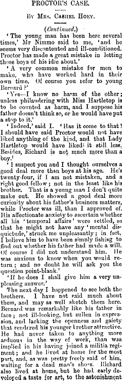 PROCTOR'S CASE. By Mks. Cabhel Hoey. (Continued.) ' The yonng man has been here several times,' Mr Nimmo said to me, 'and he seems very discontented and ill-conditioned. Proctor has made a great mistake in letting those boys of his idle about.' ' A very common mistake for men to make, who have worked hard in their own time. Of course you lefer to young Bernard ?' ' Yes—l know no harm of the other; unless philandering with Miss Hartletop is to be counted as harm, and I suppose his father doesn't think so, or he would have put a stop to it.' ' ludeed,' said I. ' Has it come to that 1 I should have said Proctor would not have liked anything of the kind, and that Lady Hartletop would have liked* it still less, Besides, Richard is nos much more than a boy.' ' 1 suspect you and I thought ourselves a good deal more than boys at his age. He's twenty four, if 1 am not mistaken, and a right good fellow ; not in the least like his brother. That is a young man I don't quite make out. He showed a good deal more curiosity about his father's business matters, while Proctor was ill, than I approved of. His affectionate anxiety to ascertain whether all his 'temporal affairs' were fettled, so that he might not have any ' mental dpquietude,'struck me unpleasantly; in fact, I believe him to have been simply fishing to find out whether his father had midc a will. Of course I did not understand him. He was anxious to know when you would return ; and no doubt he will ask you the question point-blank.' ' If he does I shall give him a very unpleasing answer.' The next day I happened to see both the brothers. I have not paid much about them, and may as well sketch them here. Bernard was remarkably like his father in face ; not ill-looking, but sullen in expression, and lacking tlie openness and gaiety that rendered hiß younger trother attractive. He had never taken to anything more arduous in the way of work, than was implied in his having joined a militia regiment; and he lived at home for the most part, and, as was pretty freelv said of him, waiting for a dead man's sho°s. Richard also lived at home, but be had early developed a taste for art, to the astonishment