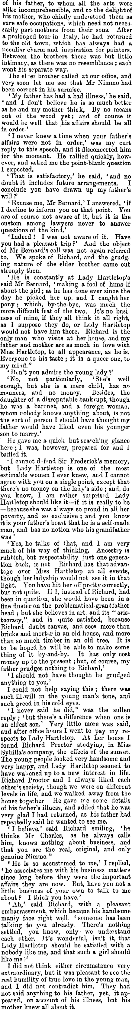 erf his father, to whom all the arts were alike incomprehensible, and to the delight of his mother, who chiefly understood them as sure safe occupation*, which need not necessarily part mothers from their sons-. After a prolonged tour in Italy, he had returned to the old town, which has always had a peculiar charm and inspiration for painters. Between the brothers there was but little intimacy, as theie was no resemblauce ; each went bis separate way. The el 'er brother called at our office, and very soon let me see that Mr Nimmo had been correct in his surmise. ' My father has had a bad illness,' he said, ' and I don't believe he is so much better as he and my mother think, By no means out of the wood yet; and of course it would be well that his affairs should be all in order.' ' I never knew a time wheu your father's affairs were not in order,' was my curt reply to this speech, and it disconcerted him for the moment. He rallied quickly, however, and asked me the point-blank question I expected. 'That is satisfactory,' he said, 'and no doubt it includes future arrangements. I conclude you have drawn up my father's will ?' ' Excuse me, Mr Bernard,' I answered, 'if I decline to inform you on that point. You are of course not aware of it, but it is the custom among lawyers never to answer questions of the kind.' ' Indeed ! I was not aware of it. Have you had a pleasant trip ?' And the object of Mr Bernard's call was not again referred to. We spoke of Richard, and the grudging nature of the elder brother came out strongly then. 'He is constantly at Lady Hartletop's said Mr Bernard, 'making a fool of himsdf about the girl; as he has done ever since the day he picked her up, and I caught her pony; which, by-the-bye, was much the more difficult feat of the two. Jt's no business of mine, if they all think it all right, as I suppose they do, or Lady Hartletop would not have him there. Richard is the only man who visits at her houee, and my father and mother are as much in love with Miss Hartletop, to all appearance, as he is. Everyone to his taste 5 it is a queer one, to my mind." ' Don't you admire the young lady ?' 'No, not particularly, 'She's well enough, but she is a mere child, has no manners, and no money. Besides, the daughter of a disreputable bankrupt, though he was a baronet, and a foreign woman, wtiom nobody knows anything about, is not the sort of person I should have thought my father would have liked even his younger son to marry.' He gave me a quick but sea-ching glance here ; 1 was, however, prepared for and I baflled it. *I cannot d f:-nd Sir Frederick's memory, but Lady Hartletop is one of the most estimable women I ever knew, and I cannot agree with you on a single point, except that there's no money on the lady's side ; and, do you know, I am rather surprised Lady Harlletop should like it—if it is really to be —becauseshe was always so proud in all her poverty, and so exclusive ; and you know it is your father's boast tbat he is a self-made man, and has no notion who his grandfather was ' 'Yes, he talks of lhat, and I am very much of his way of thinking. Ancestry is rubbish, but respectability, just one generation bick, is not Richard has that advantage over Miss Hartletop at all events, though her ladyship would not see it in that light. You have hit her off pretty correctly, but not quite. If I, instead of Richard, had been in question, she wonld have been in a fine fluster on the problematical-grandfather head ; but she believes in art, and its " aristocracy,", and is quite satisfied, because Richard daubs canvas, and see* more than bricks and mortar in an old house, and more than so much timber in an old tree. It is to be hoped he will be able to make some thing of it by-and-by. It has only cost money up to the present ; but, of course, my father grudges nothing to Richard.' ' I should not have thought he grudged anything to you.' I pould not help saying this; there was such ill-will m the young man's tone, and such greed in his cold eyes. 'I never said he did," was the sullen reply ; 'but there's a difference when one is an eldest son.' Very little more was said, and after office hours I went to pay my respects to Lidy Hartletop. At her house I found Richard Proctor studying, in Mis 3 Sybilla's company, the effects of the sunset. The young people looked very handsome and very happy, and Lady Harlletop seemed to have wakened up to a new interest in life. Richard Proctor and I always liked each other's society, though we wore on different levels in life, and we walked away from the house together He gave vce some details of his father's illness, and added that ho was very glad I had returned, as his father had repeatedly said he wanted to see me, ' I believe.' said Richard smiling, 'he thinks Mr Charles, as he always calls him, knows nothing about business, and that you are the real, original, and only genuine Nimmo." • He is so accustomed to me,' I replied, ' he associates me with his business matters since long before they were the important affairs they are now. But, have you not a little business of your own to talk to me about? I think you have.' ' Ah,' said Bicbard, with a pleasant embarrassmf nt, which became his handsome maniy face right well. ' someone has been talking to y o u already There's nothing settled, you know, only- we understand each other. It's wonderful, isn't it, that Lsdy Hartletop shou'd be aatistitd with a nobody like me, and that such a girl should like mer" I did not think either circumstance very extraordinary, but it was pleasant tc eee the real humility of true love in the young man, and I did not contradict him. They had not said anything to his father, yet, it appeared, on account of his illnesß, bat his mother knew all about it..