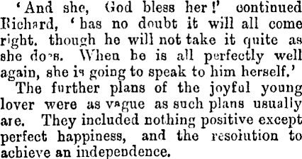 ' And she, (Jod bless her !' continued Richard, ' bas no doubt it will all come right, though ho will not take it quite as she When he is all perfectly well again, she is going to speak to him herself.' The further plans of the joyful young lover were as vague as such plans usually are. They included nothing positive except perfect happiness, and the resolution to achieve an independence.