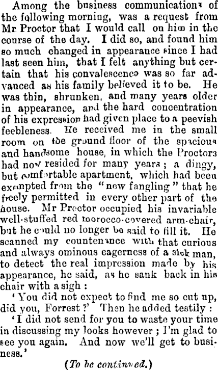 Among the business communication* of the following morning, was a request from Mr Proctor that I would call on him in the course of the day. I did so, and found him bo much changed in appearance tdnce I had last seen him, that I felt anything but certain that his convalescence was so far advanced as his family beh'eved it to be. He was thin, shrunken, and many years older in appearance, ar>J the hard concentration of his expression had given place to a peevish feebleness. He received me in the small room on toe ground Jloor of the spacious and handsome house, in which the Proctors had mK resided for many years ; a dingy, but comfortable apartment, which had been expmpted from the "now f angling " that he permitted in every other part of the nouse. Mr Proctor occupied his invariable well-stuffed red morocco-covered arm-chair, but hecmld no longer bo said i 0 fill it. He scanned my countenance with that curious and always ominous eagerness of a siolt man, to detect the real impression by his appearance, he said, as ho sank back in his chair with a sigh : ' You did not expect to find me so cut up, did you, Forrest ?' Than he added testily : ' I did not send for you to waste your time in discussing my looks however ; J 'm glad to Eee you again. And now we'll get to business.' (To br, continued.)
