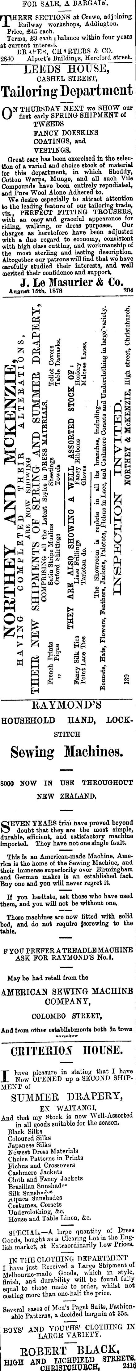 FOR SALE, A BARGAIix. iHREE SECTIONS at Crewe, adpining u. Railway workshops, Addington. Price, £45 each. Terms, £3 ca3h; balance within four years at current interest. DRAPE*, CHARTERS & CO. 2840 Alport's Buildings, Hereford street. LEEDS HOUSE, CASHEL STREET, Tailoring Department ON THURSDAY NEXT we SHOW our first early SPRING SHIPMENT of TWEEDS FANCY DOESKINS COATINGS, and VESTINGS. Great care has been exercised in the selecWon of a varied and choice stock of material for this department, in which Shoddy, Cotton Warps, Mungo, and all such Vile Compounds have been entirely repudiated, and Pure Wool Alone Adhered to. We desire especially to attraot attention to the leading feature of our tailoring trade, viz., PERFECT FITTING TROUSERS, with an easy and graceful appearance for riding, walking, or dress purposes. Our oharges as heretofore have been adjusted with a due regard to economy, consistent with high class cutting, and workmanship of the most sterling and lasting description. Altogether our patrons will find that we have oarefully studied their interests, and well merited their confidence and support. J. Le Masurier & Co. Anjrort lKth. 1878 W>4 *° A In 1! H * £S ._ "".fit _ 13 rjoo a S ! •■5 _« C/3 rt B 3 CO RAYMOND'S HOUSEHOLD HAND, LOCKSTITCH Sewing Machines. 8000 NOW IN USE THROUGHOUT NEW ZEALAND. SEVEN YEARS fcriai have proved beyond doubt that they are the most simple, durable, efficient, and satisfactory machine Imported. They have not one single fault. This Is an American-made Machine. America is the home of the Sewing Machine, and their Immense superiority over Birmingham and German makes is an established faot. Buy one and you will never regret it. If you heßltate, ask those who have used them, and you will not be without one. These machines are now fitted with solid bed, and do not require [screwing to the table. F YOU PREFER A TREADLE MACHINE ASK FOR RAYMOND'S No.l. May be had retail from the AMEBICAN SEWING MACHINE COMPANY, COLOMBO STREET, And dom other establishment* both In town CRITERION HOUSE. I have pleasure in stating that I have Now OPENED up a SECOND SHIPMENT of SUMMER DEAPERY, EX WAITANGI, And that my Stock is now Well-Assorted in all goods suitable for the season. Black Silks Coloured Silks Japanese Silks Newest Dress Materials Choice Patterns in Prints Fichus and Crossovers Cashmere Jackets Cloth and Fancy Jackets Brazilian Sunshade Silk Snnsh*** Alpaca Sunshades Costumes, Corsets TTnderclothing, &c House and Table Linen, &c. SPECIAL.—A large quantity of Dress Goods, bought as a Clearing Lot in the English market, at Extraordinarily Low Prices. IN THE CLOTHING DEPARTMENT I have just Received a Large Shipment of Melbourne-made Goods, which in style, finish, and durability will be found fully equal to those made to order, whilst not coating more than one-half the price. Several cases of Men's Paget Suits, Fashionable Patterns, a decided bargain at 355. BOYS' AND YOUTHS' CLOTHING IN LARGE VARIETY eobeet"black, HIGH AND LICHFIELD STREETS. CHRISTOHUBCfI, 2*16