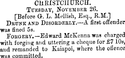 CHRISTCHURCH. Tuesday, November 20. [Before G. L. Mellish, Esq., R.M.] Drunk and Disorderly—A first offender was fined ss. Forgery.— Edward McKenna was charged with forging and uttering a cheque for £7 10s, and remanded to Kaiapoi, where the olienco was committed.