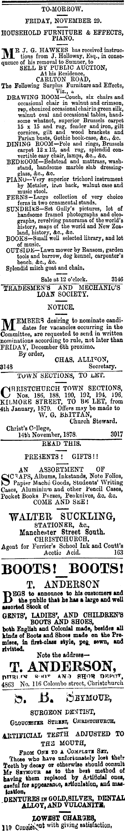 TO-MORROW. FRIDAY, NOVEMBER 29. HOUSEHOLD FURNITURE & EFFECTS, PIANO. ME J. G. HAWKES has received instructions from J. Holloway, Esq., in consequence of his removal to Sumner, to SELL BY PUBLIC AUCTION, At his Residence, CARLTON ROAD, The Following Surplus Furnitare and Effects, Viz. a DRAWING ROOM—Couch, six chairs and occasional chair in walnut and crimson, rap, ehonized occasional chair in green Bilk, walnut oval and occasional tables, handsome whatnot, superior Brussels carpet 15 x 15 and rug, fender and iron, gilt cornices, gilt and wood brackets and Parian busts, Gothic book-case, &c, &c. DINING ROOM—Pole and rings, Brussels carpet 12 x 12, and rug, splendid convertible easy chair, lamps, &c, &o. BED ROOM—Bedstead and mattrass, washstand, handsome marble slab dressingglass, &C, &C PIANO —Very superior trichord instrument by Metzler, iron back, walnut case and music stool. FERNS—Largo collection of very choice ferns in two ornamental stands. SUNDRIES—Set Gully's pictures, lot of handsome framed photographs and oleographs, revolving panorama of the world's history, maps of the world and New Zealand, history, &c, &c. BOOKS—Small well selected library, and lot of music. OUTSIDE—Lawn mower by Ransom, garden tools and barrow, dog kennel, carpenter's bench : &c, &c. Splendid milch goat and chain. Sale at 12 o'clock. 3146 TRADESMEN'S AND MECHANICS LOAN SOCIETY. NOTICE. 1/TEMBERS desiring to nominate candi[Vl dates for vacancies occurring in the Committee, are requested to send in written nominations according to rule, not later than FRIDAY, December 6th proximo. By order, CHAS. ALLFON, 3148 Secretary. TOWN SECTIONS, TO LET. TOWN SECTIONS, J Nos. 186, 188. 190, 192, 194, J 96, KILMORE STREET, TO BK LET, from 4th January, 1879. Offers may be made to W. G. BRITTAN, Church Steward. Christ's College, 14th November, 1878. 3017 READ THIS. PRESENTS ! GIFTS !! AN ASSORTMENT OF Albums, Inkstands, Note Folios, KJ Papier Machu Goods, Students' Writing Cases, Aluminium and other Pencil Cases, Pocket Books Piirses, Penknives, &c. &c. COME AND SEE! WALTEU "SUCKLING, STATIONER, &0., Manchester Street South. CHRISTCHDRCH. Agent for Ferrier's School Ink and Coutt's Acetic Acid. IC3 BOOTS! BOOTS! T. ANDERSON iEGS to announce to hla onsnomera and __ > the publlo that he haa a large and well assorted Stock of GENTS', LADIES', AND CHILDREN'S BOOTS AND SHOES, both English and Colonial made, besides all kinds of Boots and Shoes made on the Premises, In firat-olara style, peg. sewn, and livitted. Note the address— T. ANDERSON, piTRI 'V a »or UNO fiH<'>l DWPOT, 4863 No. 11.6 Colombo street, Christchurch k7 t jJ* fc'BYMOUK* SURGEON DENTIST, Glooosbtkb Skbjub, Chkihtohukoh, ARTIFICIAL TEOT ADJUSTED TO TH3 MOUTH, FaOM OWS TO i. OOMPLBT* S*T. "those who have unfortunately lost their 'JtV.eth by decay or otherwise should oonsult Mr Sstmoub aa to the best method of having them replaced by Artificial ones, asefo?for appearance, arttonhiloa, and masloatfoo, DENTURES ih GOLD, SILVER, DENTAL ALLOY, AND VULCANITE, LOWISTOHAB3BB, U 9 CoDfliato?** with & iym & Bati ß fact to»-