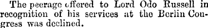 The peerage offered to Lord Odo Bussell in recognition of his services at the Berlin Congress was declined.