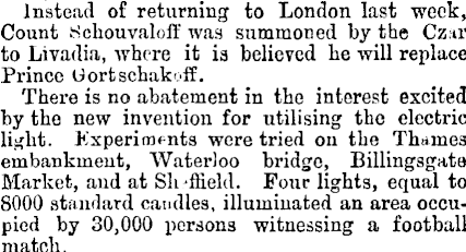 Instead of returning to London last week, Count Schouvaloff was summoned by the Czar to Livadia, where it is believed he will replace Prince Gortscbak'ff. There is no abatement in the interest excited by the new invention for utilising the electric light. Experiments wore tried on the Thames embankment, Waterloo bridge, Billingsgate Market, and at Sh -ffield. Pour lights, equal to 8000 standard caudles, illuminated an area occupied by 30,000 persons witnessing a football match.
