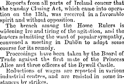 Reports from all parts of Ireland concur that the teunday Closing Act, which camo into operation on the 13th, was received in a favorable spirit and without opposition. The breach among the Home Rulers is widening Ire and tiring of the agitation, and the loaders admitting the want of popular sympathy, convened a meeting in Dublin to adopt some course for its remedy. Proceedings have been taken by the Board of Trade against the first mate of the Princess Alice and three officers of the Bywcll Castle. Reductions of wages arc reported in various industrial centres, and arc resisted in some instances by strikes.