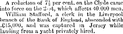 A reduction of 7A- ])cr cent, on the Clyde came into force on tlio 12< sfc, wliich affects dO.OUO men. William Stafford, a cleric in the Liverpool branch of the Lank of England, absconded with <£15,000, and was captured m Jersey while landing from a yacht privately hired.
