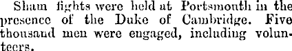 Sham lights were hold at Portsmouth in the presence of the Duke of Cambridge. Five thousand men were engaged, including volunteers.