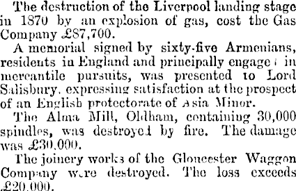 The destruction of the Liverpool landing stage in 1870 by an explosion of gas, cost the Gas Company .£87,700. A memorial signed by sixty-five Armenians, residents in England and principally engage . in mercantile pursuits, was presented to Lord Salisbury, expressing satisfaction at the prospect of an English protectorate of Asia Minor. The Alma Mill, Oldham, containing 30,000 spindles, was destroyed by fire. The damage was ,£30,000. The joinery works of the Gloucester Waggon Company w.re destroyed. The loss exceeds <£20,000.