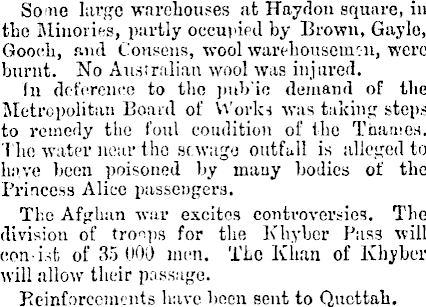Some large warehouses at Haydon square, in the Minories, partly occupied by Brown, Gayle, Gooch, and Consens, wool warehousemen, were burnt. No Australian wool was injured. In deference to the pub'ic demand of the Metropolitan Board of Works was taking steps to remedy tiie foul condition of the Thames. The water near the sewage outfall is alleged to have been poisoned by many bodies of the Princess Alice passengers. The Afghan war excites controversies. The division of troops for the Khyhcr Pass will eon-Ist of 35 000 men. The Khan of Khyber will allow their passage. Beinforccments have been sent to Qucttah.
