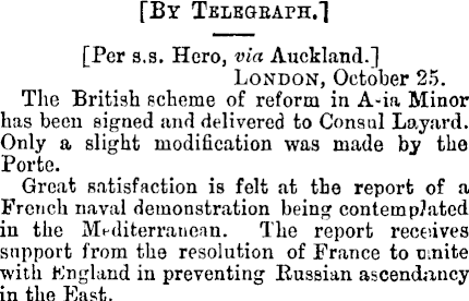 [By Telegraph.] [Per s.s. Hero, via Auckland.] London, October 25. The British scheme of reform in A-ia Minor has been signed and delivered to Consul Layard. Only a slight modification was made by the Porte. Great satisfaction is folt at the report of a French naval demonstration being contemplated in the Mediterranean. The report receives support from the resolution of Franco to mnite with England in preventing Russian ascendancy in the East.