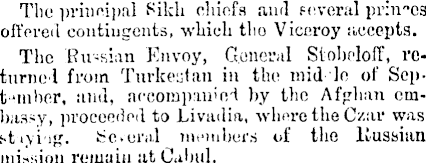 The principal Sikh chiefs and several princes offered contingents, which tho Viceroy accepts. The Russian Envoy, General Sloheloff, returned from Turkestan in the mid lo of September, and, accompanied by the Afghan embassy, proceeded to Livadia, where the Czar was st »yiog. Sc.era! members of the llussian mission remain at Cabul.